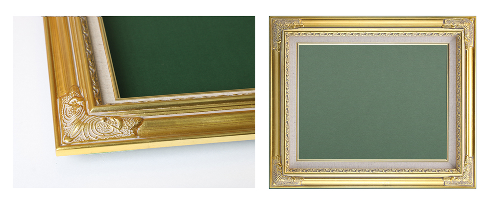Y-20ゴールドは角にシンプルな模様を施した油彩額で、シンプルさと高級感を両立した製品です。SM~F10サイズまで展開できる額縁となっています。