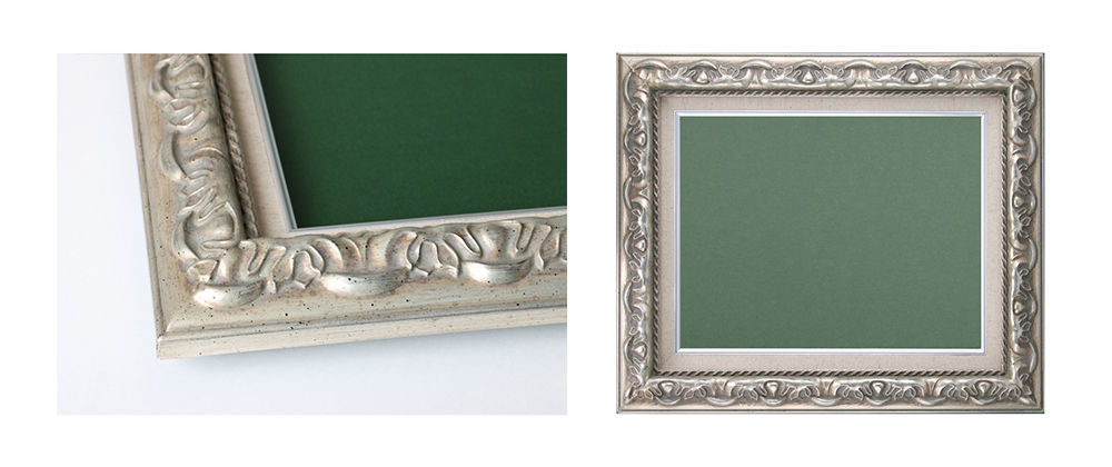 デコラティブな模様が特徴の、華やかな額縁です。落ち着いたシルバーカラーが上品さも生み出しています。