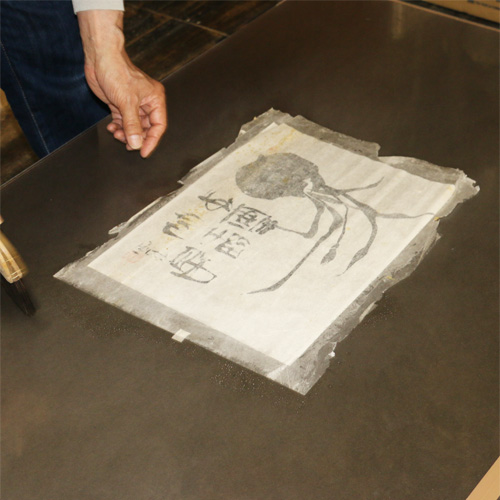 2.作品の裏側に薄い和紙を敷き、水を均一に吹きかけて折皺を伸ばします。