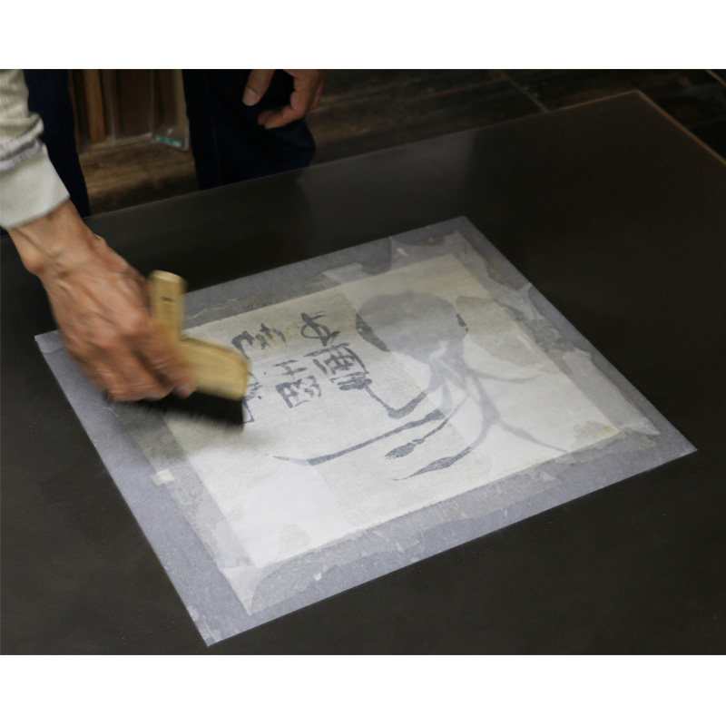 裏打ちとは「作品に薄い紙を貼る事で、作品の皺を伸ばし、又、紙を厚くすることで強度を持たせる技法です。」