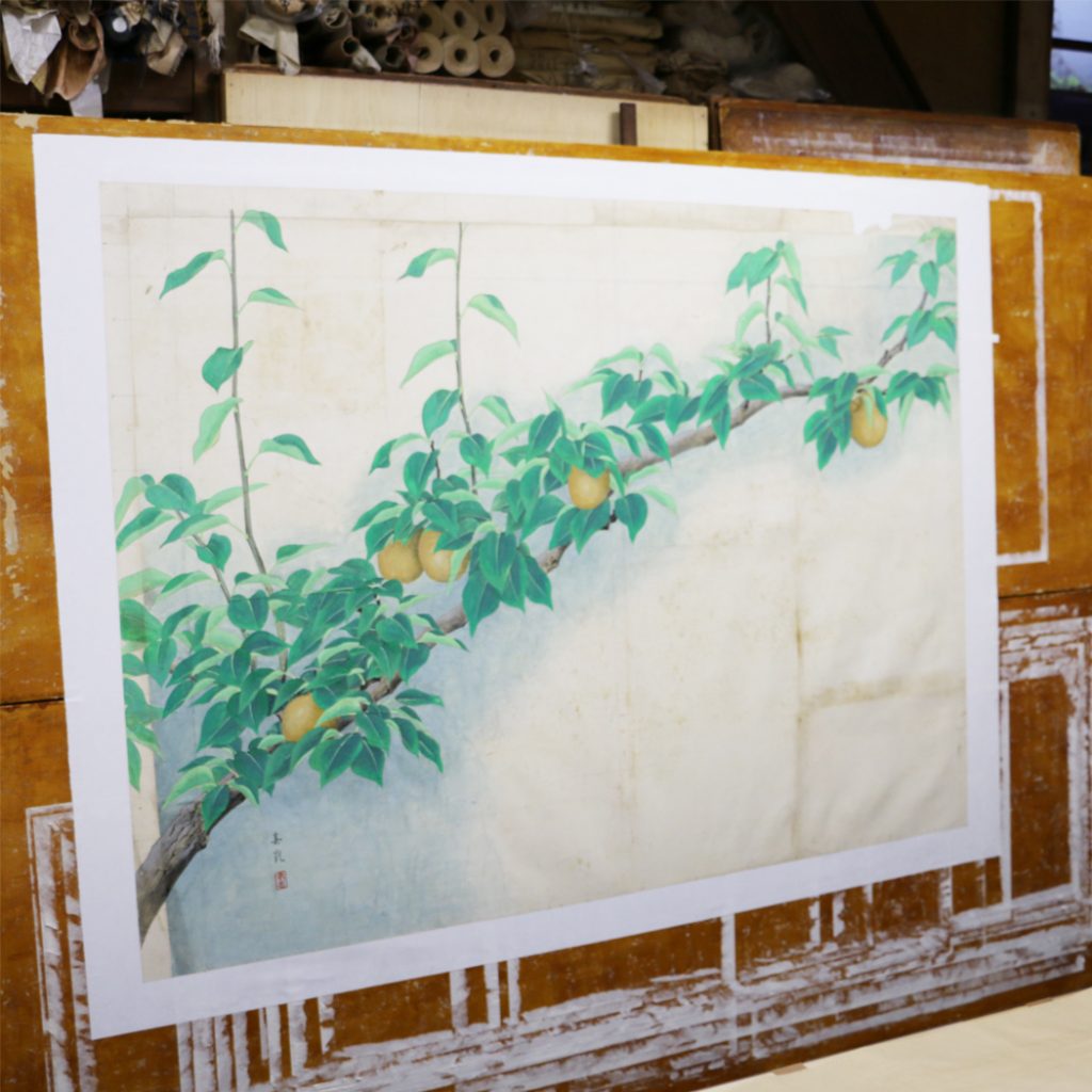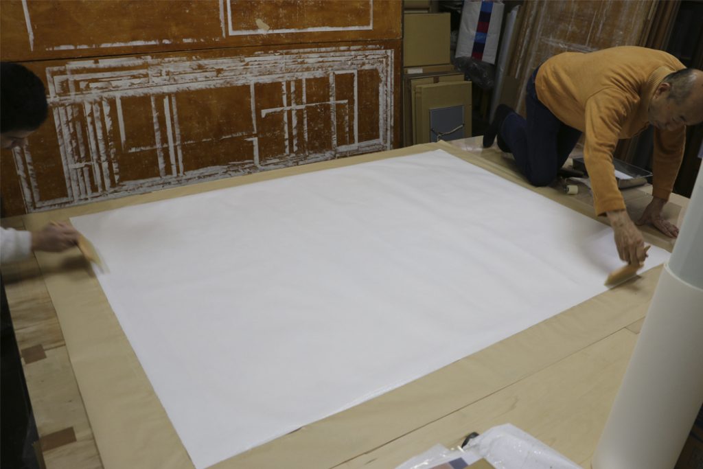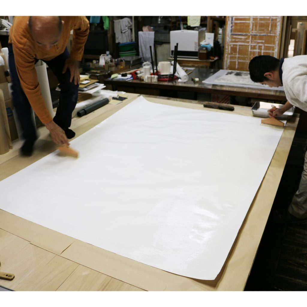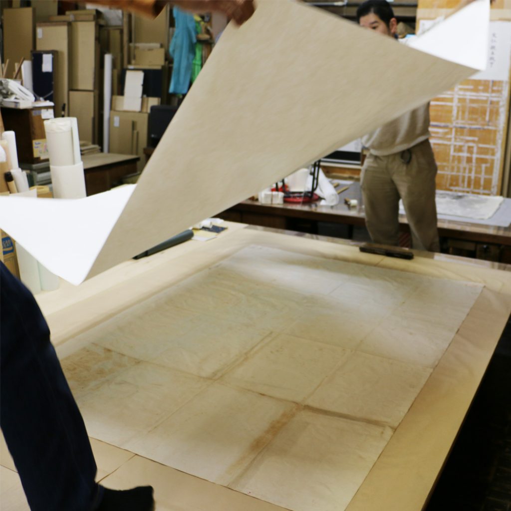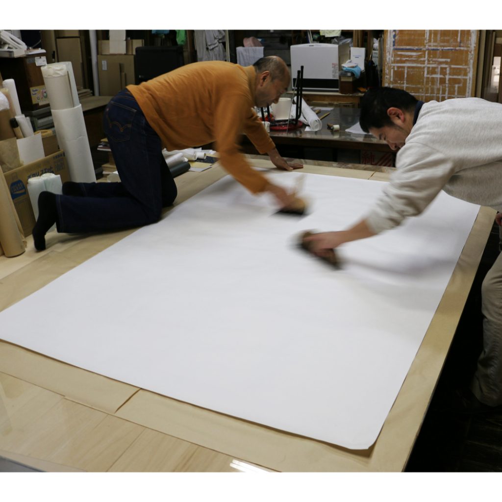 裏打ちとは「作品に薄い紙を貼る事で、作品の皺を伸ばし、又、紙を厚くすることで強度を持たせる技法です。」