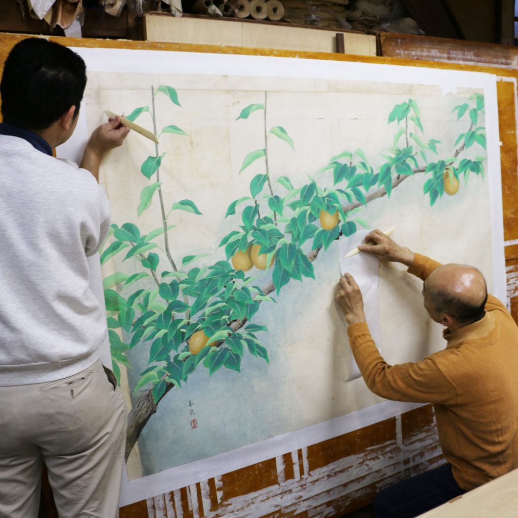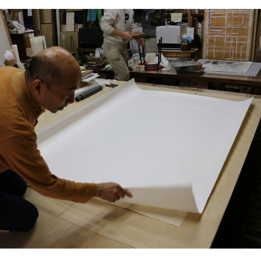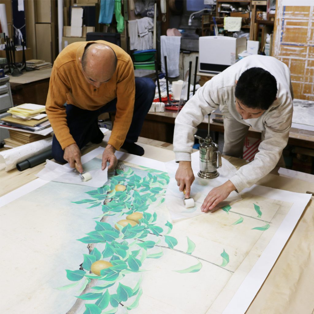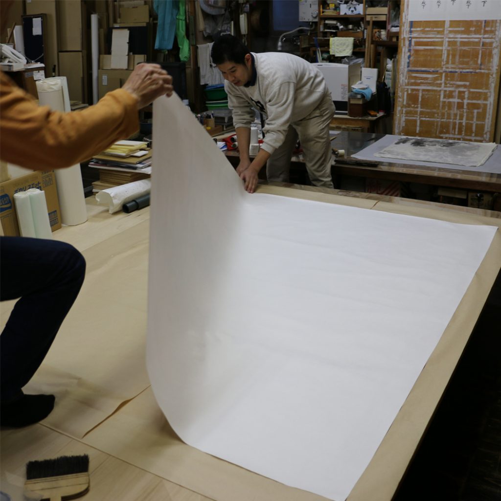 裏打ちとは「作品に薄い紙を貼る事で、作品の皺を伸ばし、又、紙を厚くすることで強度を持たせる技法です。」