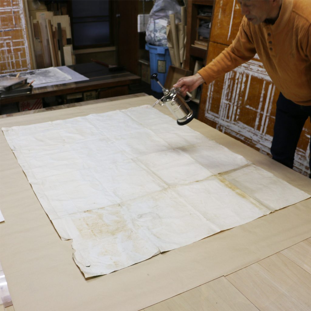 作品と和紙が付着していない個所をローラーを使って細かく補修していきます。