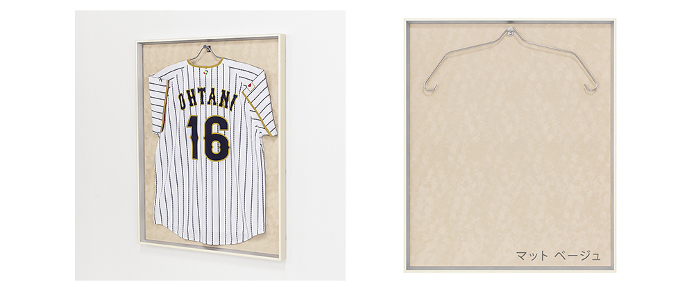 こちらのユニフォーム額も比較的手の届きやすい価格設定となっており、バックボードの色を7色の中からユニフォームの色に合わせてお好みで自由に選ぶことが可能です。木目がさりげなく主張するナチュラルカラーを採用し、額自体が主張しすぎず作品をしっかりと引き立てます。