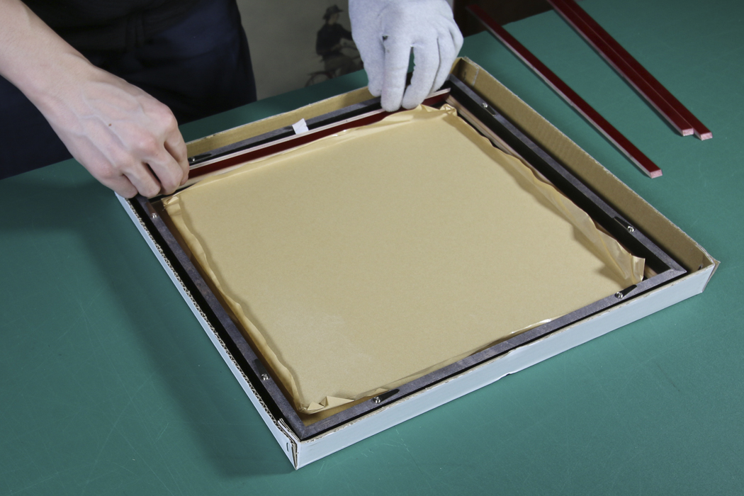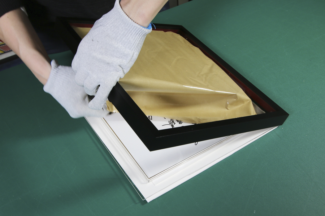 先ほど部品を取り付けた額縁を作品の上から被せます。