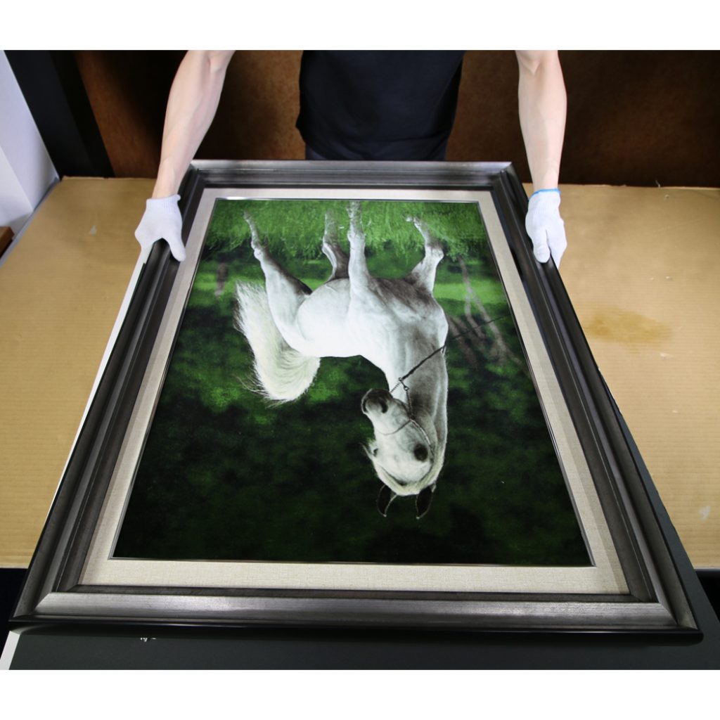 絨毯を額装するために大切な事は2つあります。1つ目は通気性を確保する事です。シルクやウール絨毯を密閉した額縁の中に収めてしまうと、通気性が悪くなるため虫が発生して作品を傷めてしまう恐れがあります。2つ目は絨毯を伸ばして額装する事です。この2点を解決するために、弊社では絨毯を皺を伸ばして木枠に張り込み、通気性を確保した状態で額縁に収めています。