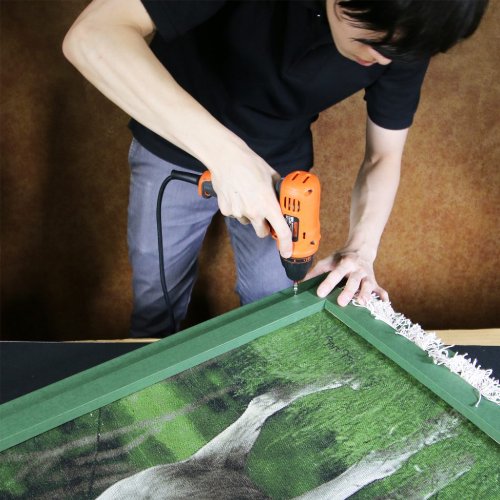 裏面から特殊な金具を使って、木枠と額縁を取り付けしていきます。