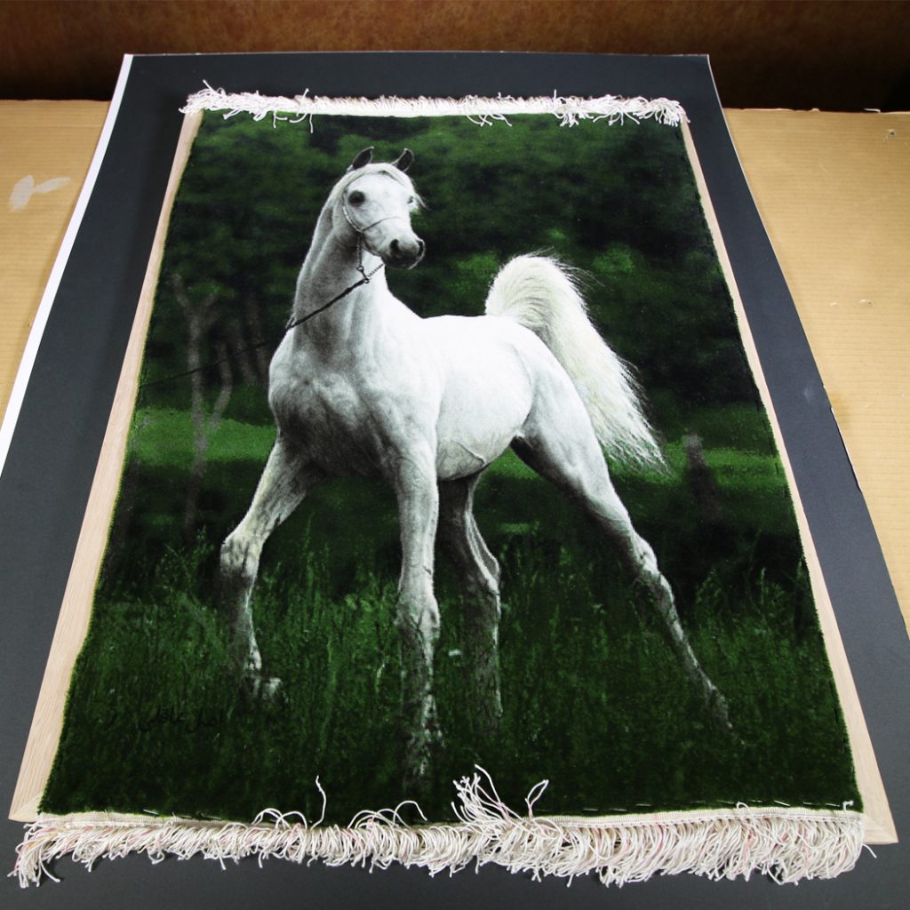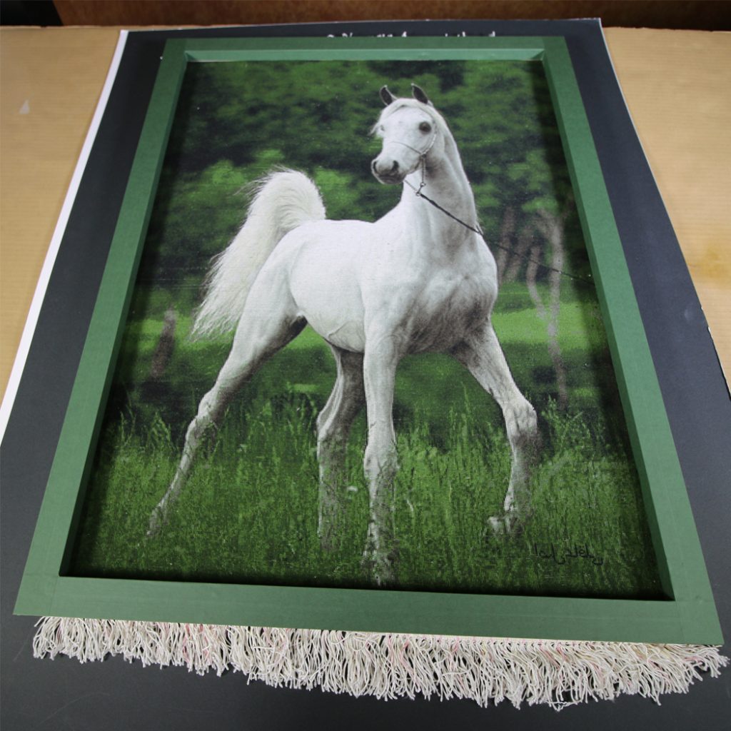 絨毯を額装する場合、皺を伸ばして額装をする必要があります。絨毯は厚いので裏打ちをすることはできません。