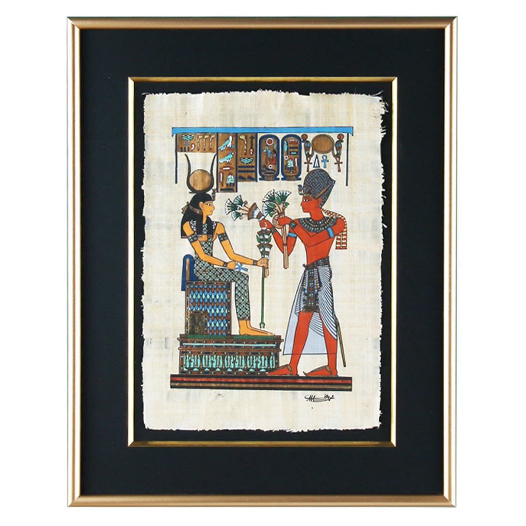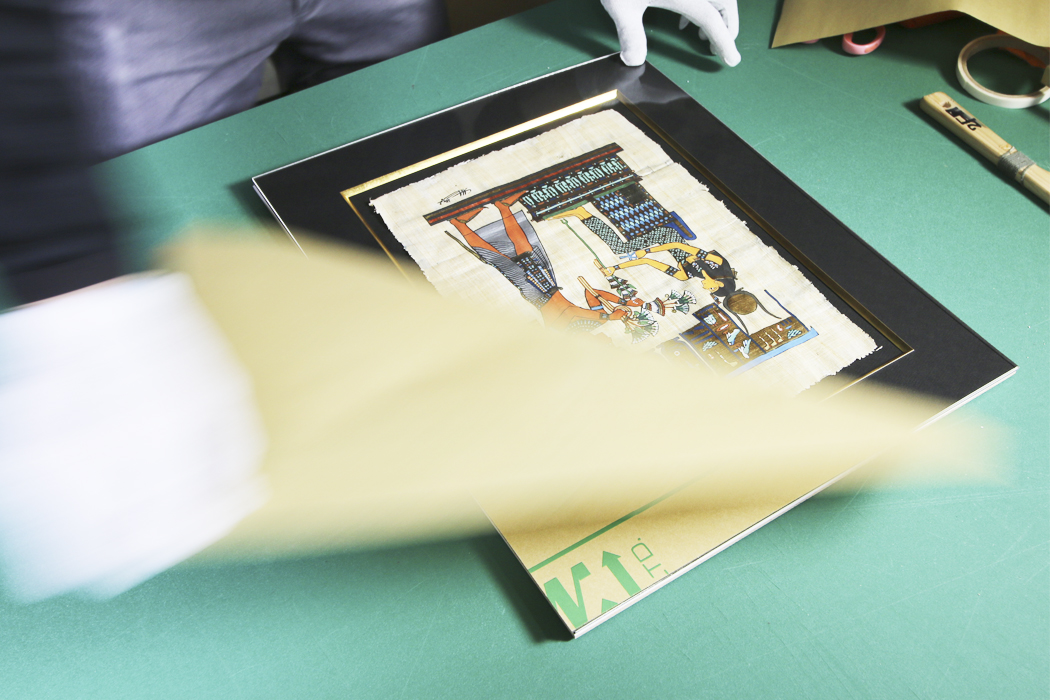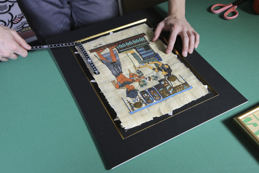 2重マット額装ですることによって、パピルス固有の凸凹感、手作り感を残した額装になります。マットにパピルスを直接固定し、作品の外側を見せ、周りに別のマットを使って作品が潰れないように額装します。