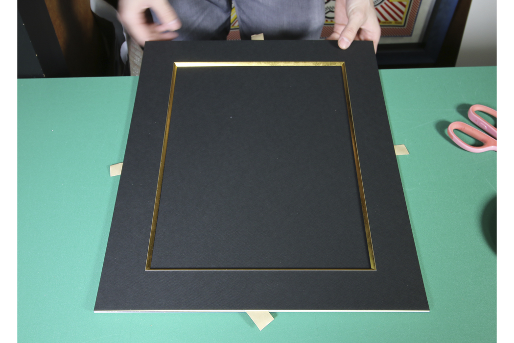 定規を使い、位置を決め、作品をマットに固定していきます。