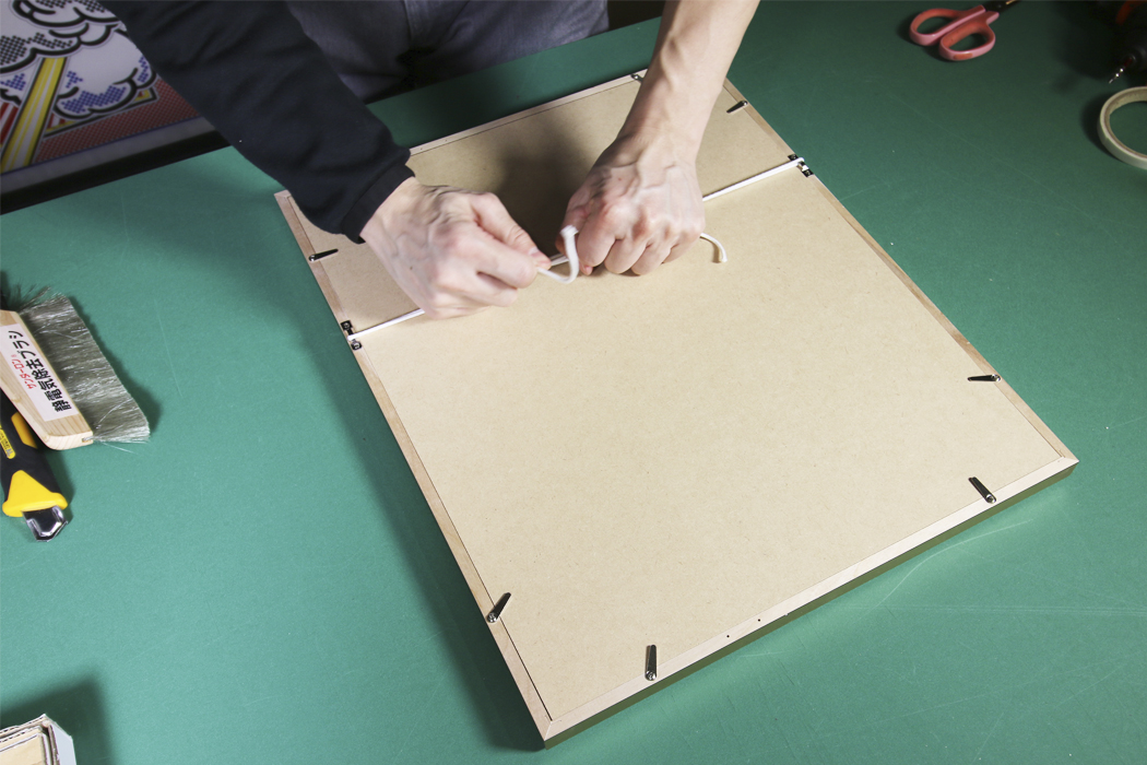 裏面にし、吊り金具、紐を取り付けます。