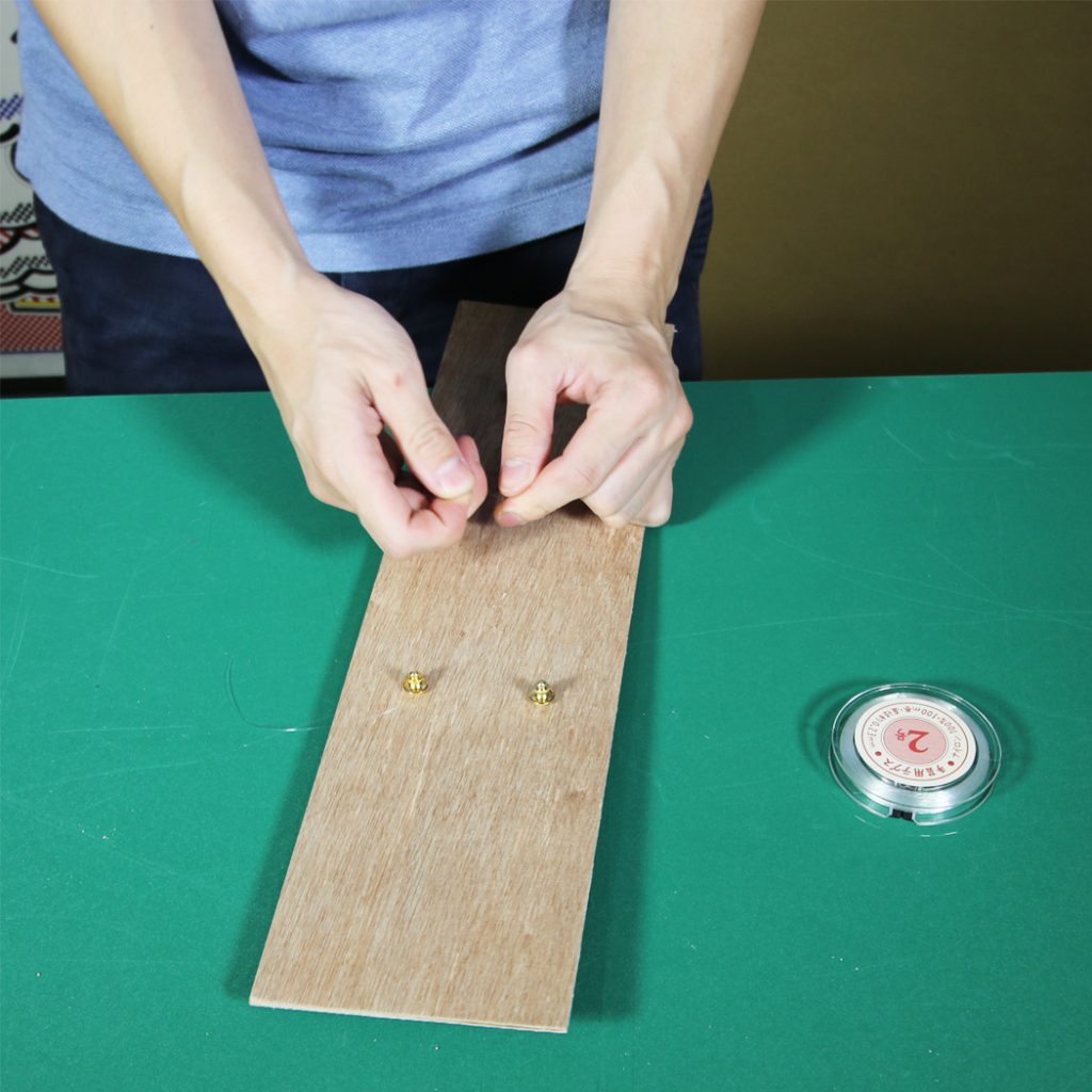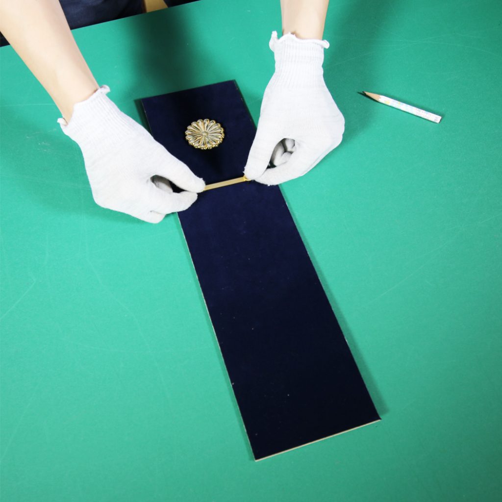 勲章を取り付けします。弊社の場合、発送できるように勲章をテグスを使って固定します。