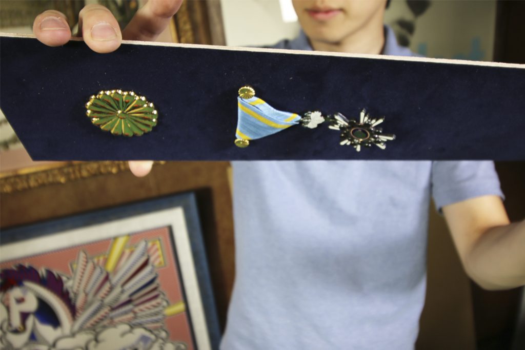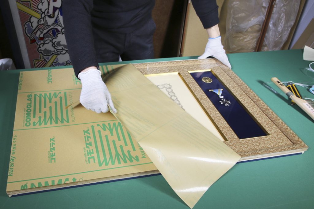 右側に賞状、左側に勲章を額装していきます。