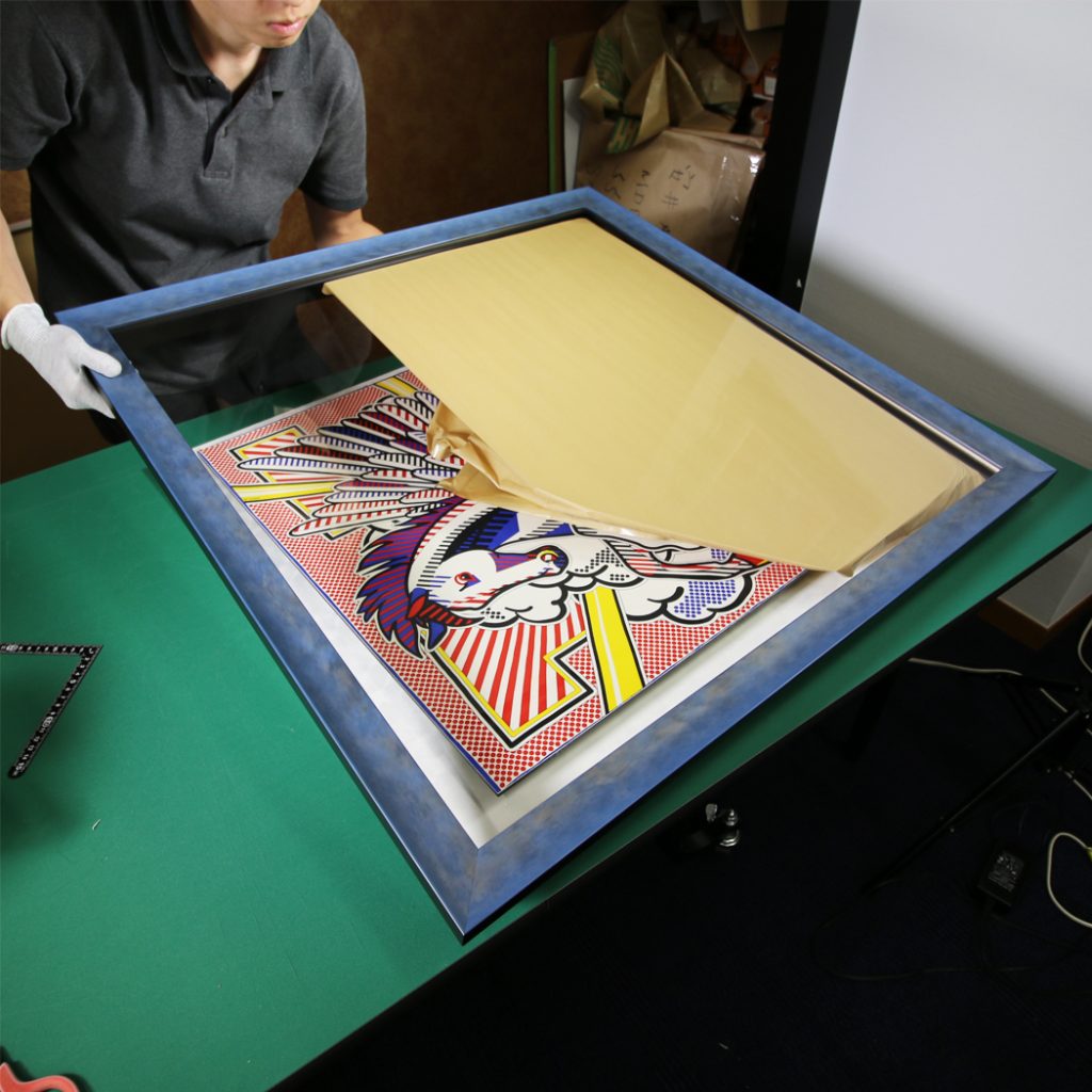 額縁を作品に取付けていきます。