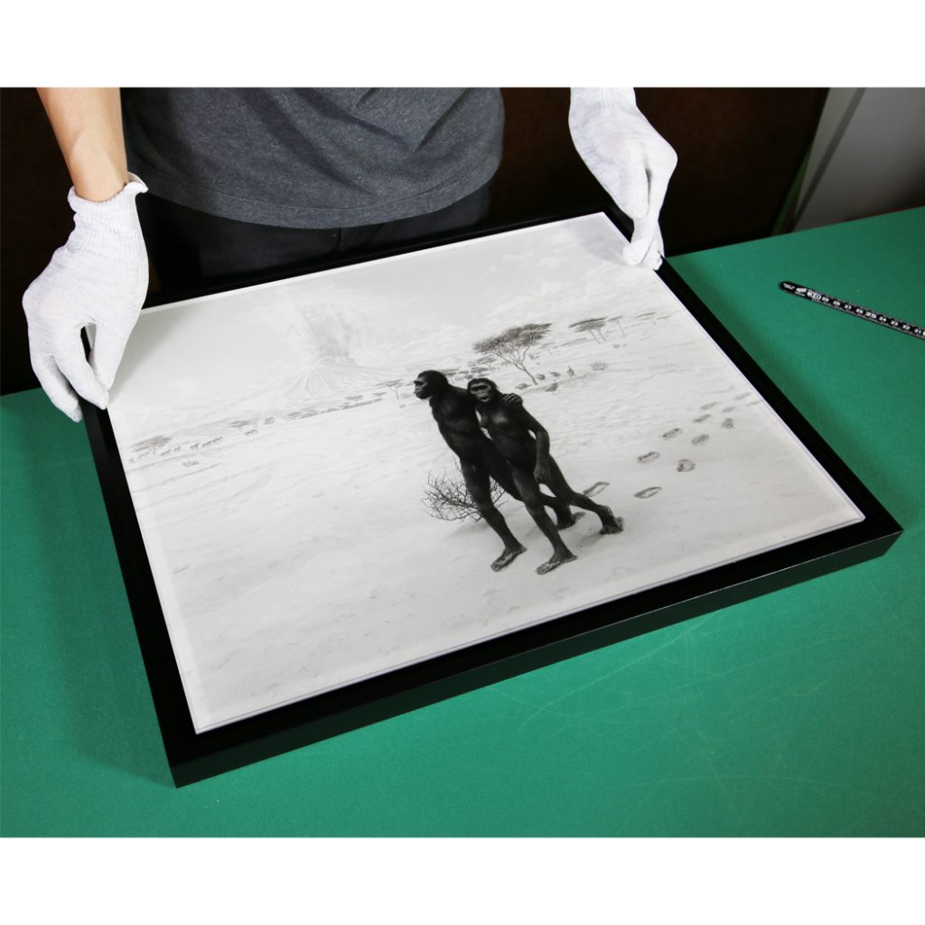 アクリル額装とは作品の表面に直接5㎜のアクリルを張り込む額装方法です。近年、写真を額装する際に使われる額装方法ですが、当店では写真だけでなく、ポスター、版画等にも応用しております。5㎜のアクリルが作品表面に張り込まれるため、視覚的に作品に奥行きが生まれます。