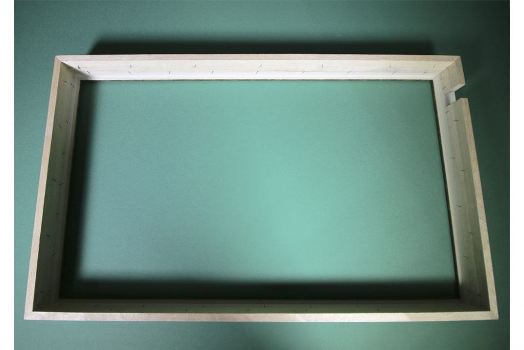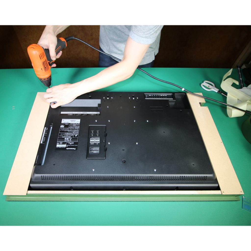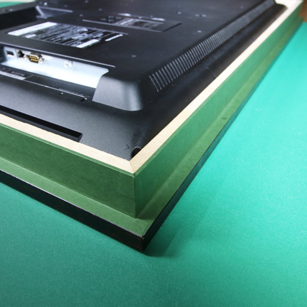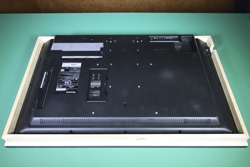 モニターの図面に合わせて、サイズ、リモコン受信部等を考慮して額縁をお作りすることをご提案しております。 今回はパナソニック製のデジタルサイネージ用のモニターを額装いたします。