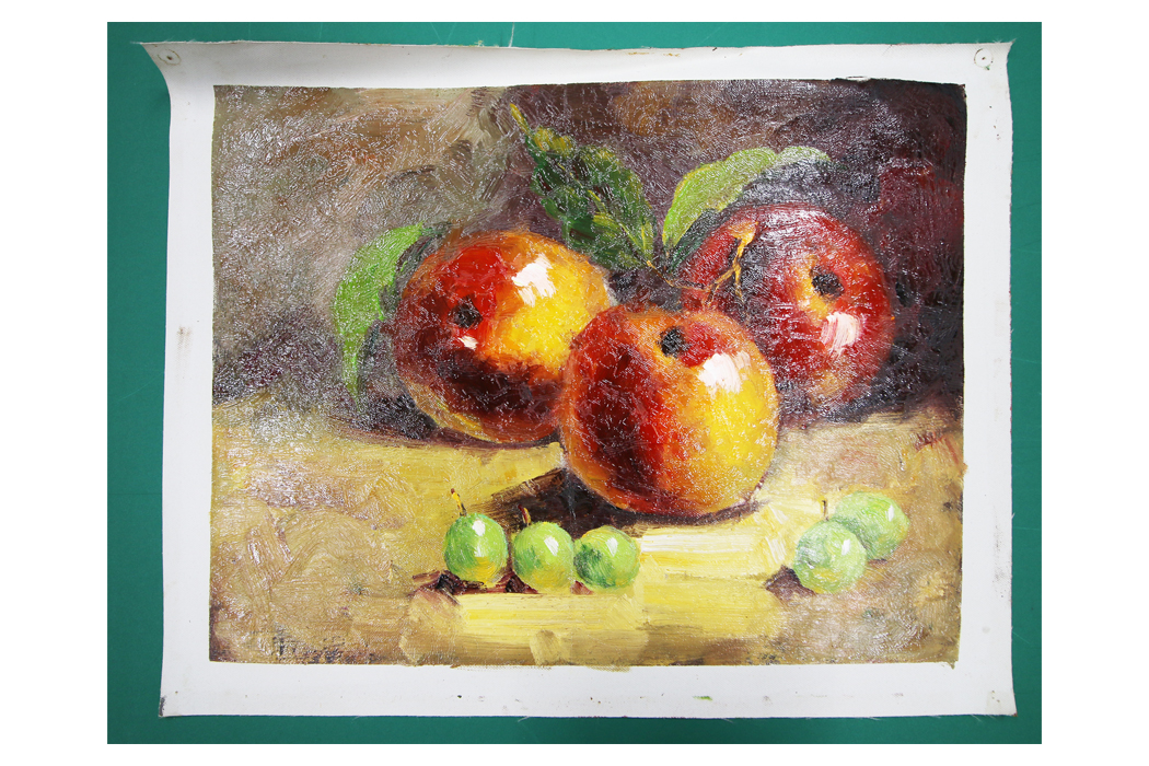 このような作品の場合、弊社ではベニア板に作品を張り込み、皺を伸ばす作業を行います。