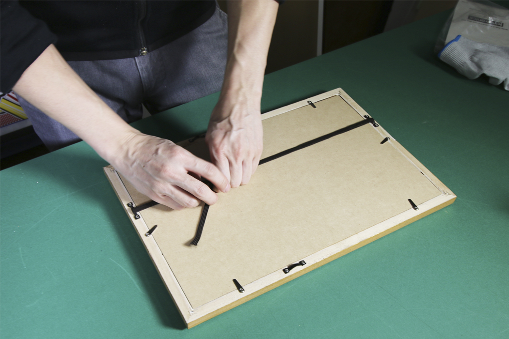裏面にして、トンボ、吊り金具、紐を取り付けます。