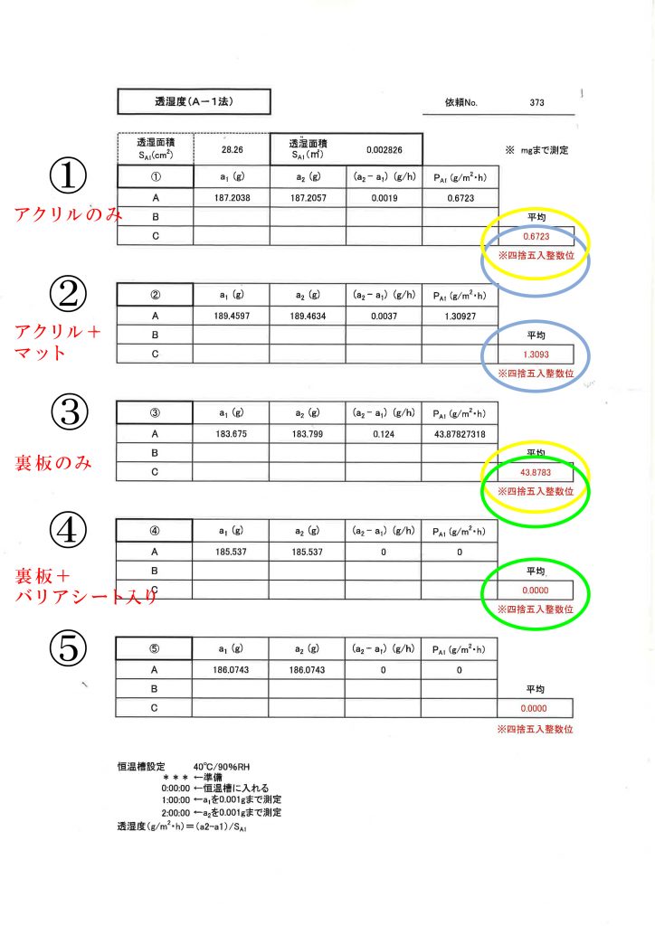 ・①と③を比較すると アクリルの透湿性を1とすると裏板の透湿性は44となり、圧倒的に裏板側から湿気が入りやすい。